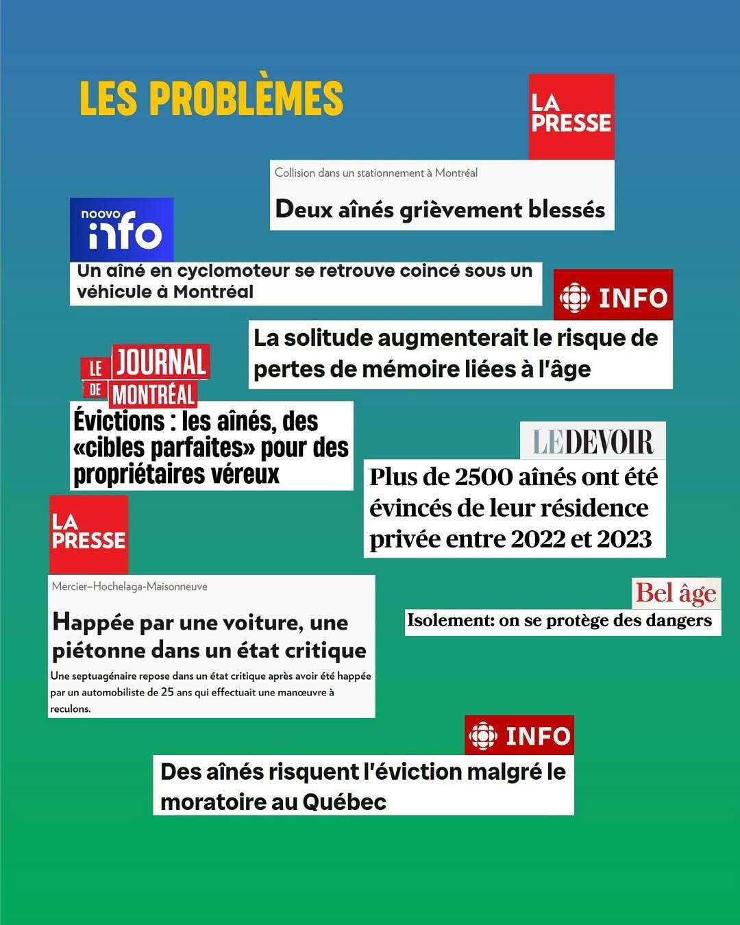 1- Sécuriser les rues et trottoirs près des CLSC et résidences pour personnes âgées, car les aîné·es sont les premières victimes des collisions routières.