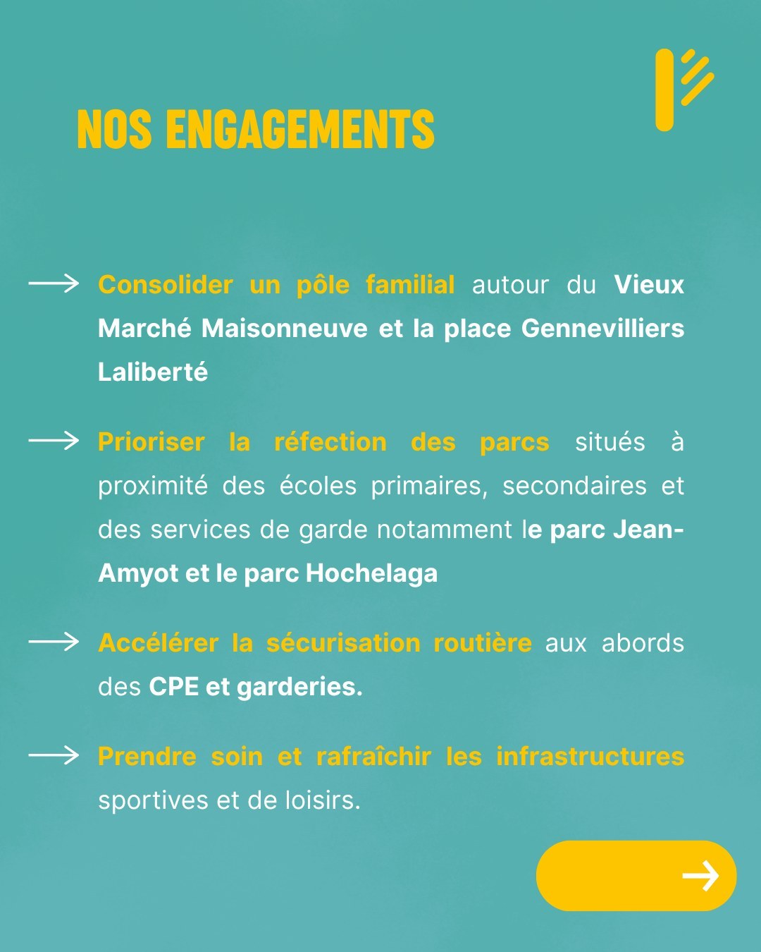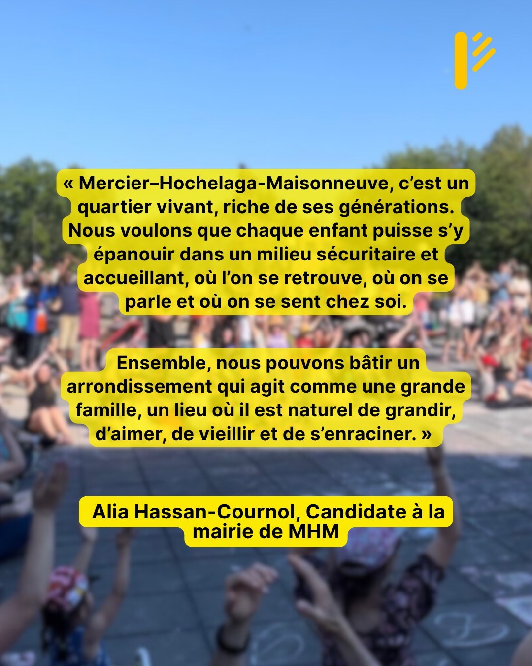 Depuis sa fondation, Projet Montréal met la qualité de vie des gens au cœur de ses actions. Dans Mercier–Hochelaga–Maisonneuve, notre équipe veut poursuivre ce travail en créant un environnement où enfants, ados, parents et aîné·es peuvent grandir, apprendre et s’épanouir ensemble.