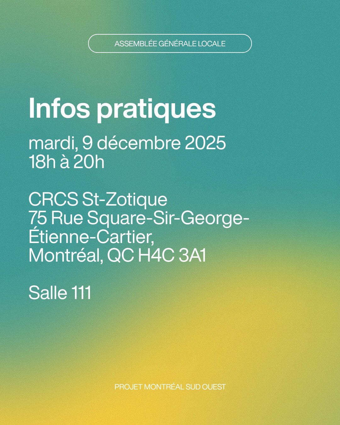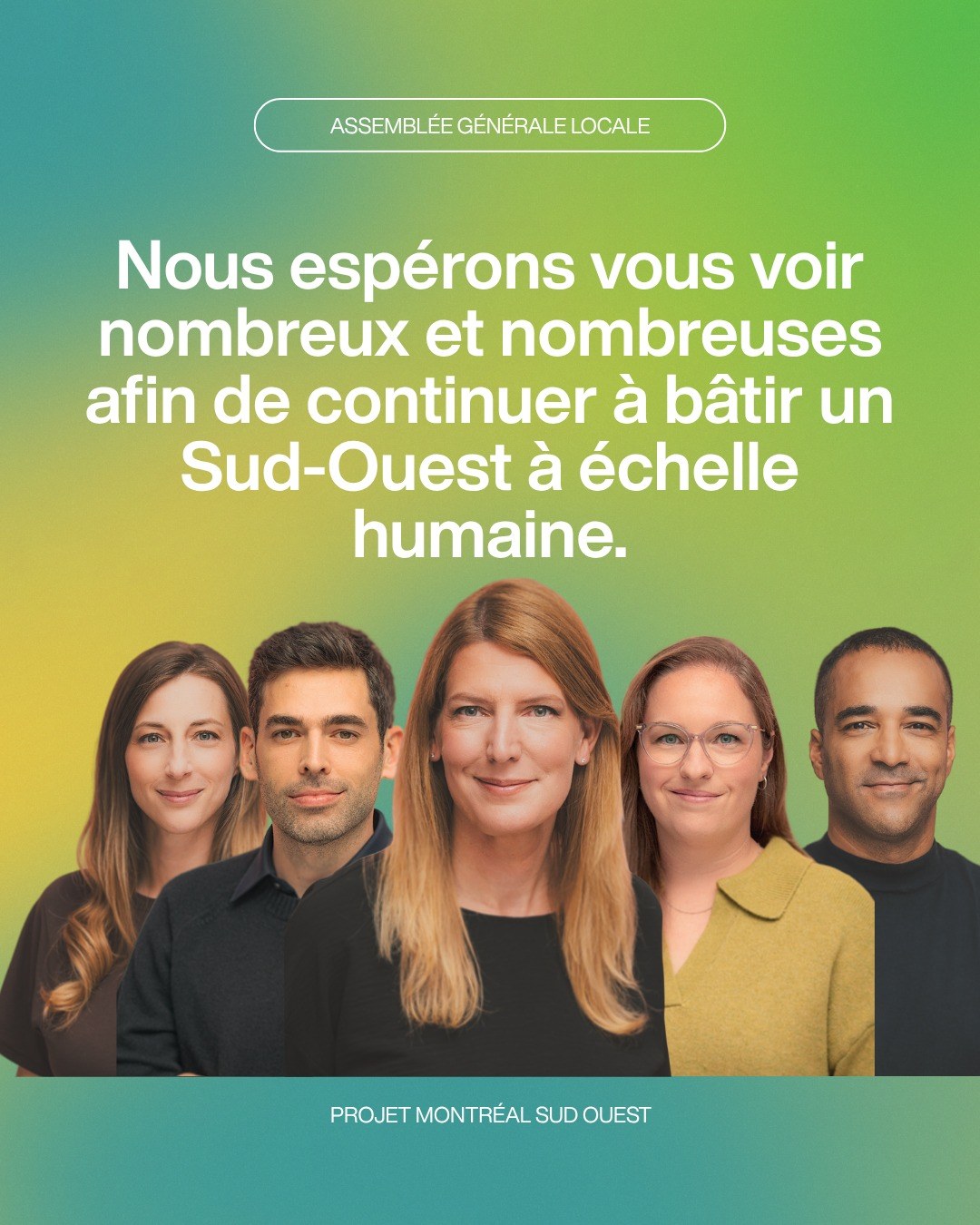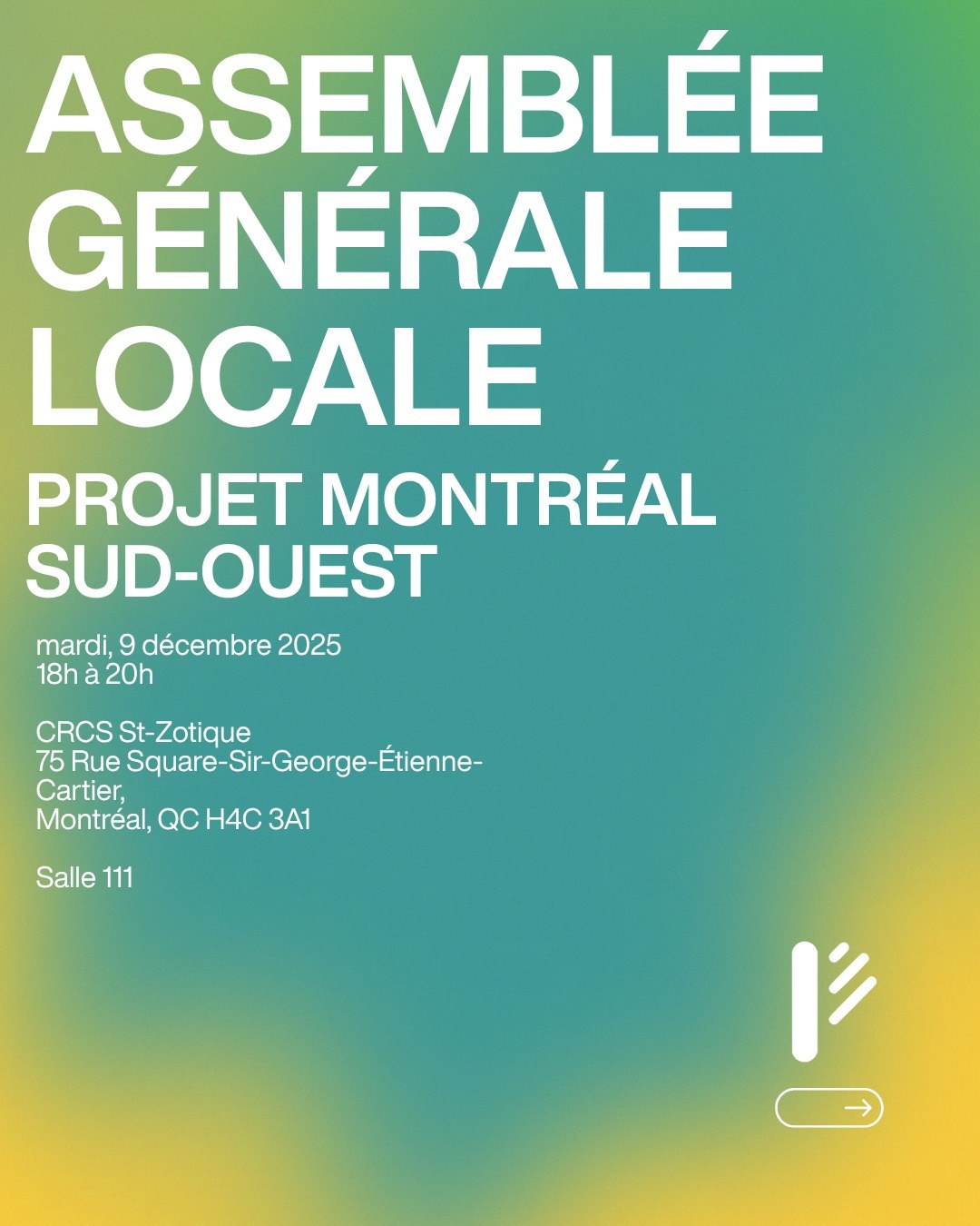 Comme vous le savez certainement, l’élection du 2 novembre a donné une victoire à l’ensemble des candidat·es de Projet Montréal dans l’Arrondissement du Sud-Ouest. Tout au long de son mandat, notre équipe locale renouvelée continuera à bâtir un arrondissement solidaire et résilient.