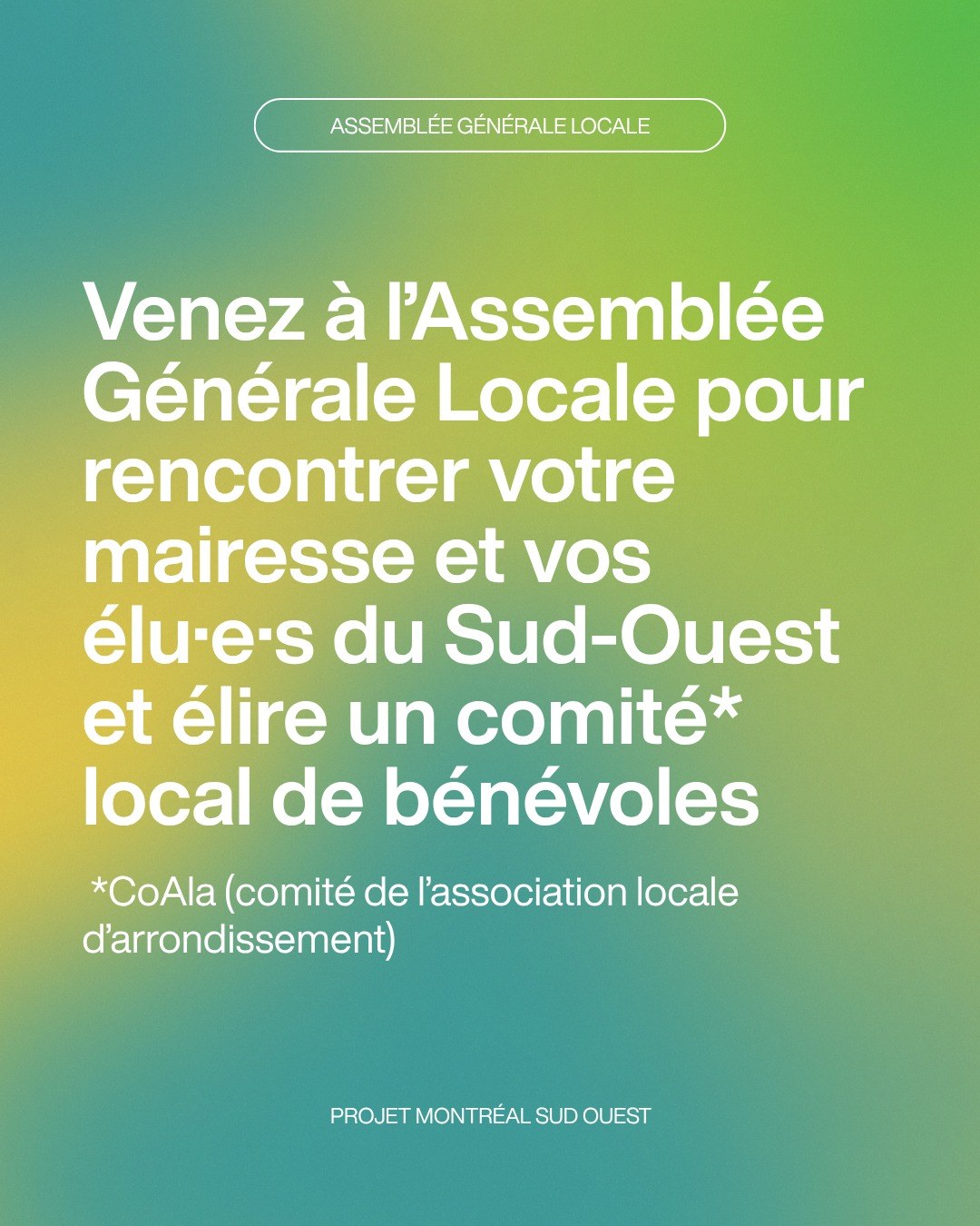 Vous êtes donc invité·es à une assemblée générale locale afin de rencontrer notre Mairesse, Véronique Fournier, nos conseillers Elise Tanguay, Catherine Houbart, Nicolas Jolicoeur et Jonathan Burnham ainsi que d’élire un comité local, composé de bénévoles, le CoALA (comité de l’association locale d’arrondissement).